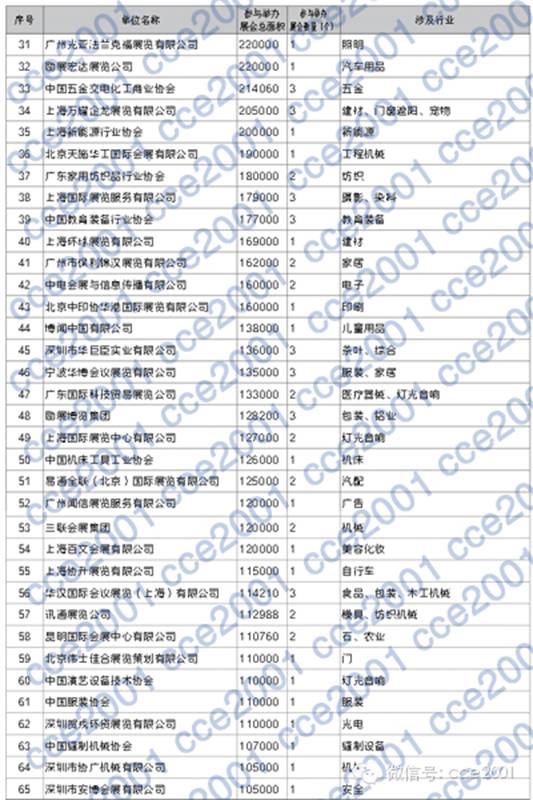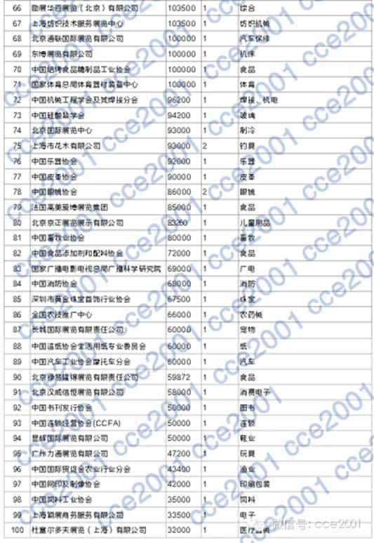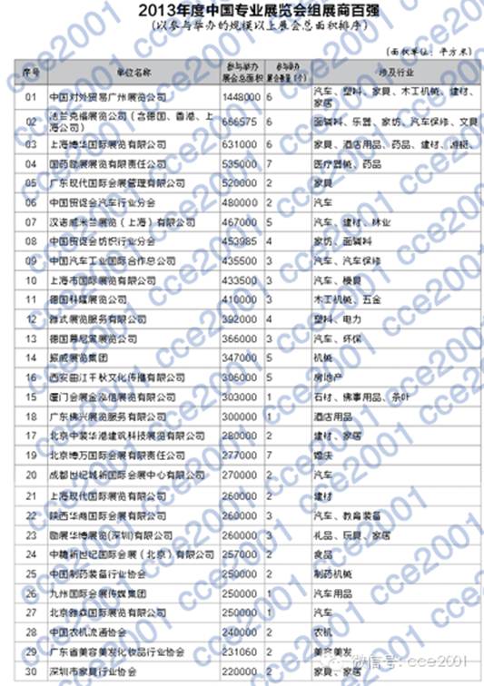 a) 附件中的百?gòu)?qiáng)名單是依據(jù)《2013年度中國(guó)規(guī)模以上展覽會(huì)動(dòng)態(tài)數(shù)據(jù)庫(kù)》的有關(guān)數(shù)據(jù)統(tǒng)計(jì)得出;參與主辦的規(guī)模以上展會(huì)總面積是能否進(jìn)入百?gòu)?qiáng)的重要指標(biāo),此外,除汽車、家居、建材、汽配、汽車用品、五金、廣告、機(jī)床、教學(xué)儀器、禮品、木工機(jī)械、印刷、石材等13個(gè)行業(yè)保留2個(gè)及以上展會(huì)主辦者入選外,其他只舉辦單一展會(huì)的組展商,原則上只保留所辦展會(huì)同行業(yè)面積排名第一者;?